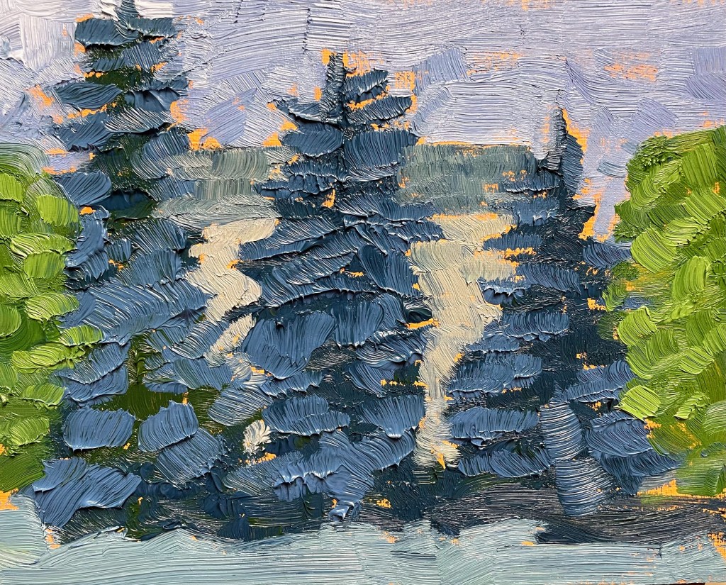 My plein air group session got cancelled today due to the poor air quality that has blanketed Ottawa for the past few days, so I decided to come up with my own plein air study. These are 3 trees across the road from my house. I decided to paint them as the sun was setting, but it got dark fast, so I was painting in almost total darkness. The end result was more painterly than my usual paintings, for sure.