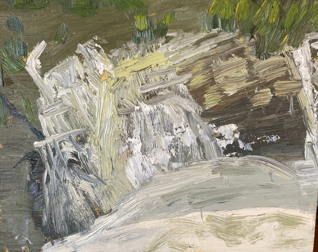 Kind of a weird story to share about this plein air experience. I met up with the Manotick Art Association Plein Air group this past Thursday at 9:30am, this time at Hog’s Back Park, which is a beautiful park right in the middle of Ottawa that features waterfalls and tall trees. We spread out across the park shortly after the start time, and so I walked around a bit until I selected a spot that had a good view of the falls.