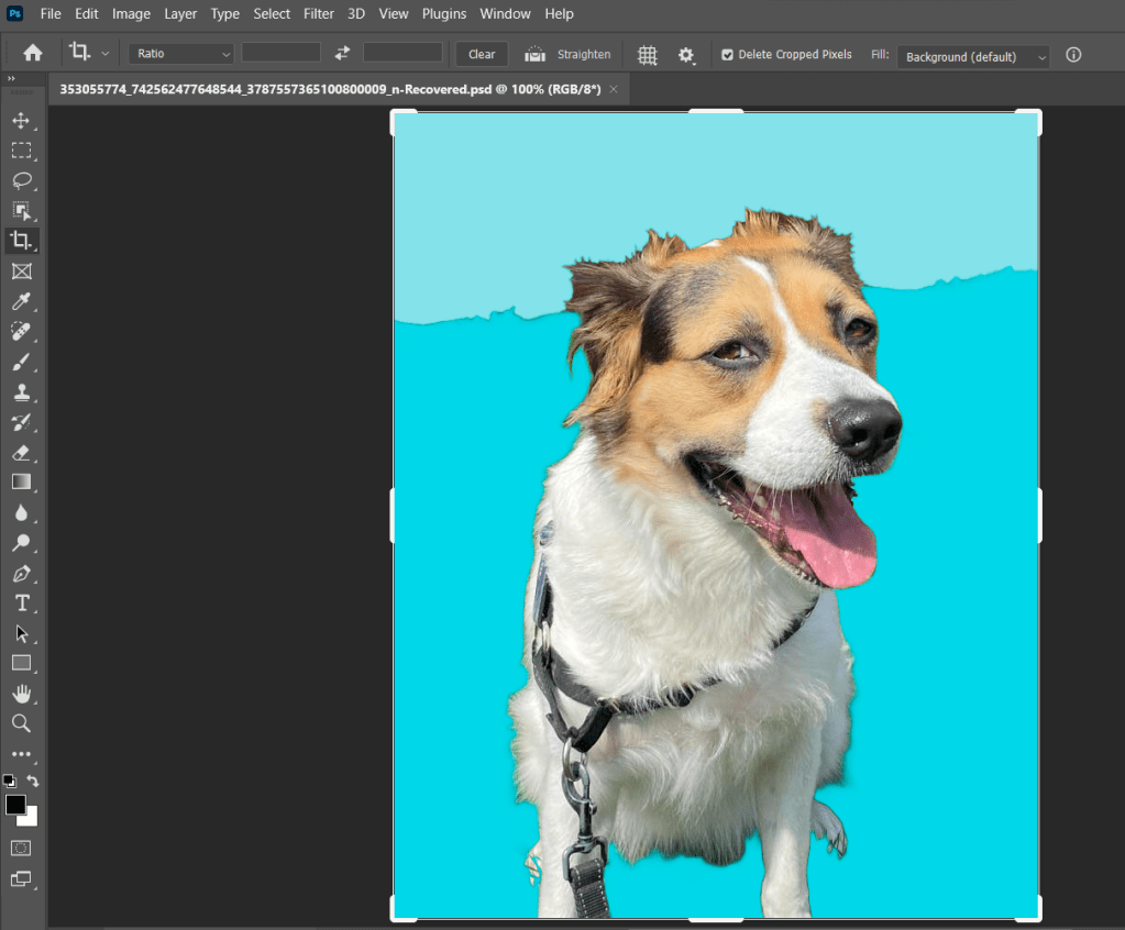 It took me some time to figure out what to do with the background, as I felt the green grass and brown fence didn’t make the dog stand out, and would not look good in a painting, so I opened up the photo in Adobe Photoshop and started auto-filling the background with colours that would compliment the browns on the dog’s face.