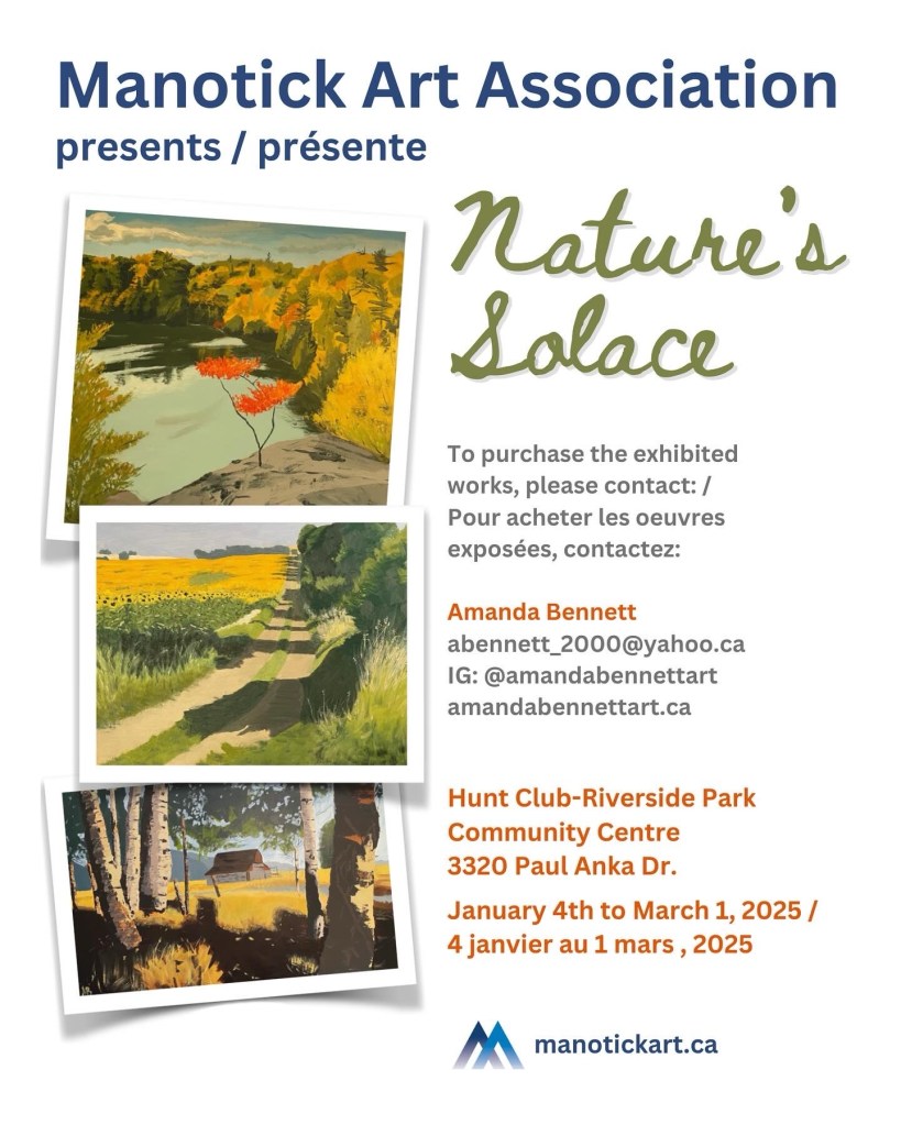 My latest exhibit, Nature’s Solace, is now on display at the Hunt Club Riverside Park Community Centre, 3320 Paul Anka Drive, from Jan. 4th to Mar. 1st. It features nine oil and acrylic landscape paintings.