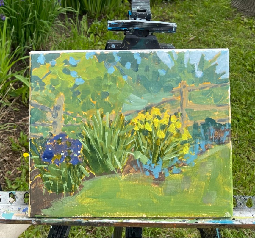 Today was the first gathering of the Manotick Art Association plein air painters, and the weather turned out better than expected! We gathered in Dickinson’s Square where there is a mill, river, and gardens. Plenty of opportunities to paint. I chose to focus on some irises that caught my eye.
